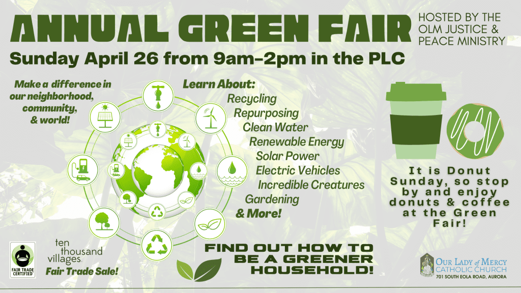 The Justice & Peace Ministry is hosting their Annual Green Fair in celebration of Earth Day and all are invited to the PLC on Sunday, April 26 from 9am to 2pm Learn about ways we can help care for the environment and improve the quality of life for future generations.…