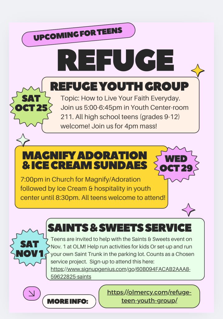 The REFUGE Teen Youth Group welcomes all high school teens (grades 9-12) to attend various events. We meet for socializing, faith sharing, service, prayer, food and fun! Teens do not even have to be Catholic to attend! All welcome, including your friends!