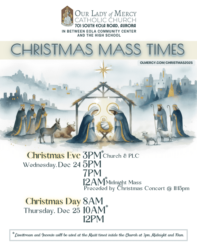 Our Christmas Eve and Christmas Day Masses will be celebrated at Our Lady of Mercy, located at 701 South Eola Road, Aurora (between the high school and the community center).
