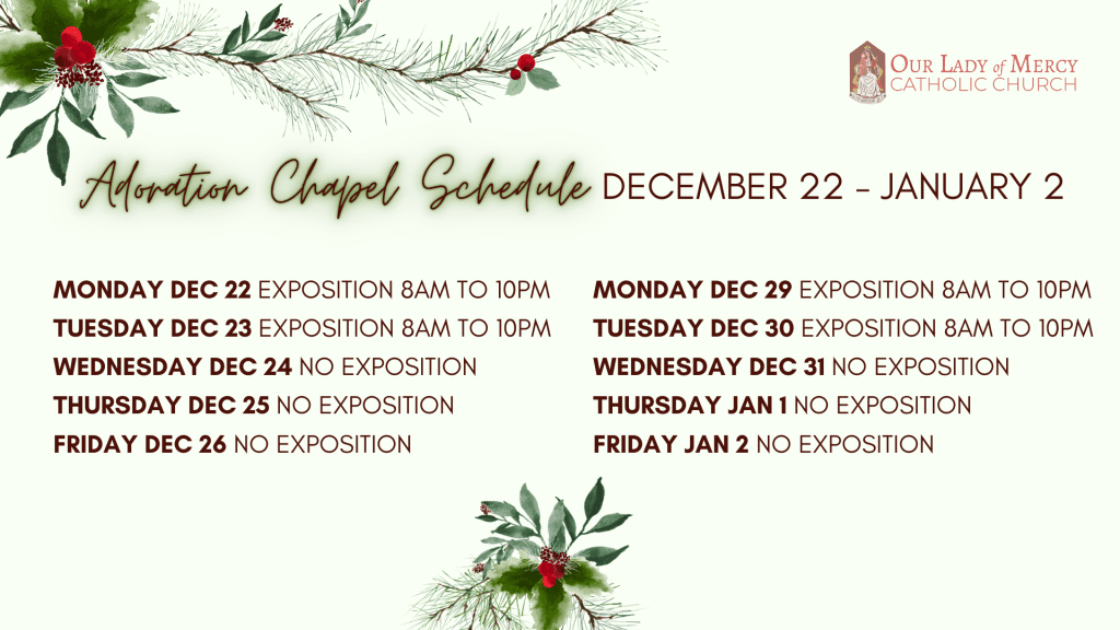 - Sunday, December 28th: Masses will be celebrated at 8:00 AM, 10:00 AM, 12:00 PM, and 5:30 PM.