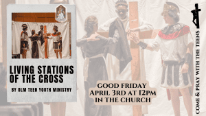 Morning Prayer 8am | 12pm Teen Living Stations of the Cross | 3pm The Passion of the Lord | 7pm Stations of the Cross in Spanish | Pontifical Good Friday Collection