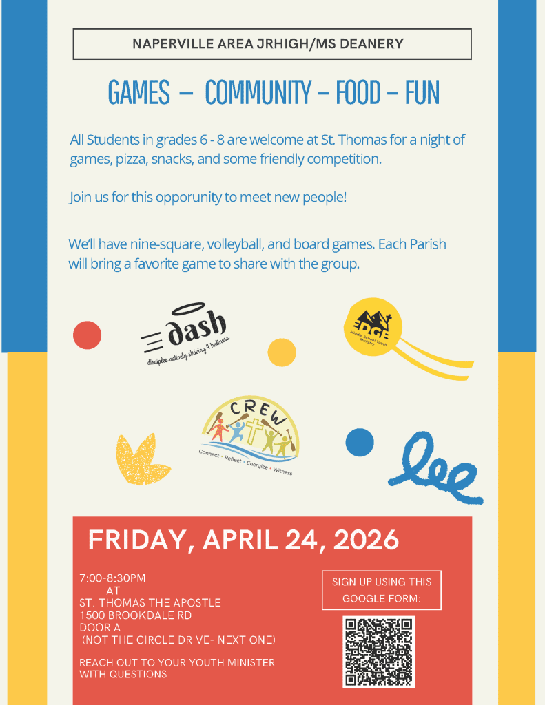 - April 24 – EDGE – Game Night at St Thomas the Apostle – Games at St Thomas the Apostle Church, Naperville. This is a combined event with St Anne, Oswego and St Thomas the Apostle, Naperville.
