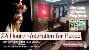 Beginning at 6:30pm on Sunday, October 12, we will hold 24 hours (plus) of Eucharistic Adoration for Peace, ending at 10pm on Monday, October 13.