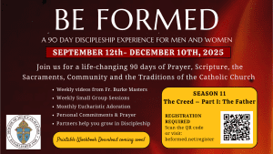 Led by Father Burke Masters, Be Formed is a 90-day discipleship experience for men and women through the Diocese of Joliet that includes weekly videos, small groups, prayer, fellowship and nights of reflection. Through Be Formed, individuals are given the opportunity to pray and listen to the spiritual, pastoral, human and intellectual commitments the Lord is calling them to focus on. Register for the next session, which runs from September 12th through December 10th, at the link here: https://beformed.net/register
