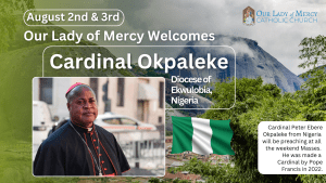 It’s not every day that Our Lady of Mercy is honored to welcome a prince of our Catholic Church — Cardinal Peter Ebere Okpaleke from Nigeria. What a blessing that Cardinal Okpaleke will be visiting us on August 2nd and 3rd, preaching at all the weekend Masses.