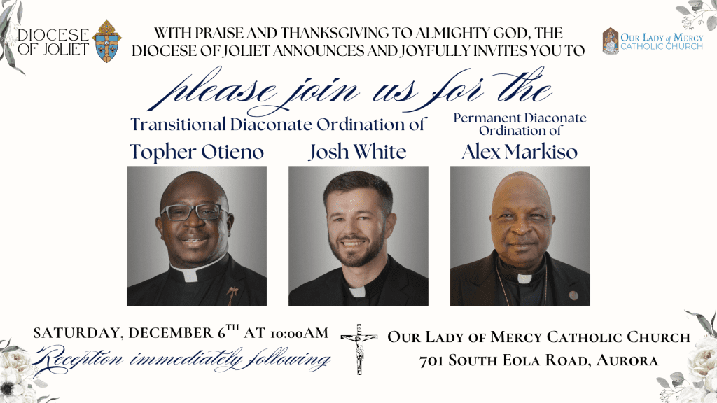 With hearts full of praise and thanksgiving to Almighty God, we joyfully share that the Diocese of Joliet invites everyone to the Transitional Diaconate Ordination of Topher Otieno and Josh White, and the Permanent Diaconate Ordination of Alex Markiso.
