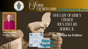 The Mass for Persons with Disabilities will be held at Our Lady of Mercy, Aurora, IL at 2:00pm on Sunday, March 1, 2026. Refreshments and fellowship to follow.