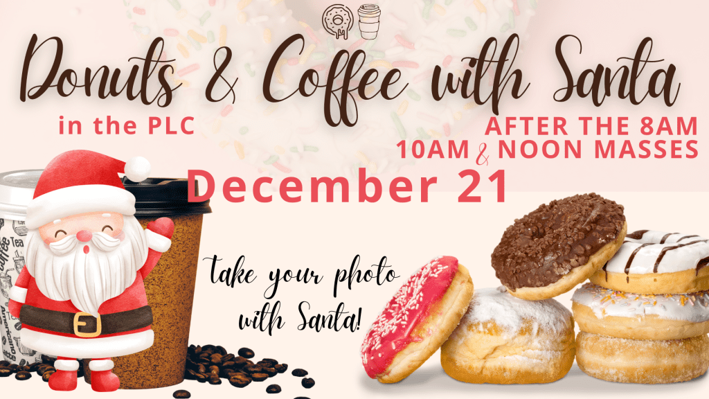 Join us in the PLC after the 8am, 10am, and Noon Masses for a cheerful morning of delicious donuts, hot coffee, and joyful fellowship—plus a visit from Santa! Grab your phones and snap a photo of your kids with Santa! 🍩☕🎅