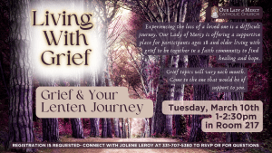 Our monthly Grief Ministry support group will meet on Tuesday, March 10th, from 1pm to 2:30pm in Room 217.