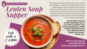 Following the 7:00 PM Stations of the Cross, the Justice & Peace Ministry invites you to a Lenten Soup Supper in the Parish Life Center. This simple gathering is a way to walk together in solidarity with those who experience hunger, sharing a humble meal of soup and bread during this sacred season.