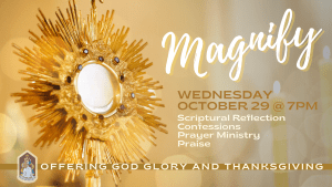 Join us for MAGNIFY on Wednesday, October 29 from 7:00–8:30pm for an evening of adoration, praise, and worship before the Blessed Sacrament. The evening will include a scriptural reflection, opportunities for confession, and prayer ministry.