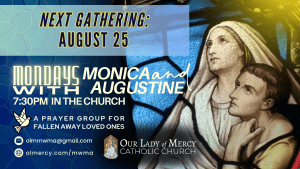 Are you carrying the heartache of a loved one who’s drifted away from the Catholic faith? You’re not alone. Inspired by the steadfast faith of St. Monica—whose prayers, tears, and witness eventually drew her son, St. Augustine, back to Christ—we gather once a month to pray for the return of those we love.