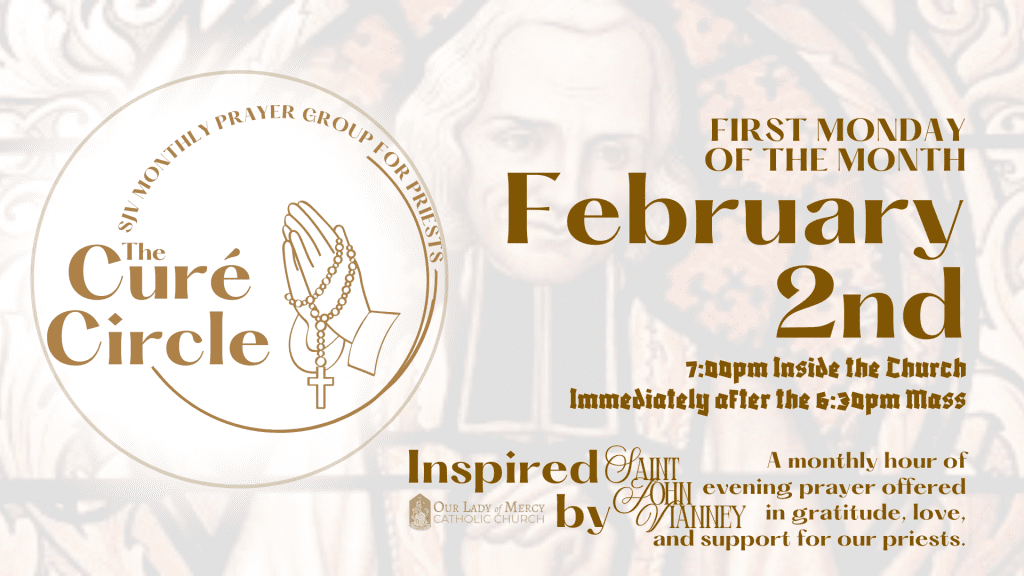 God has richly blessed Our Lady of Mercy with two faithful shepherds — Fr. Michael and Fr. Vagenas — let’s bless them in return through The Curé Circle, a monthly evening of prayer dedicated to our OLM priests.
