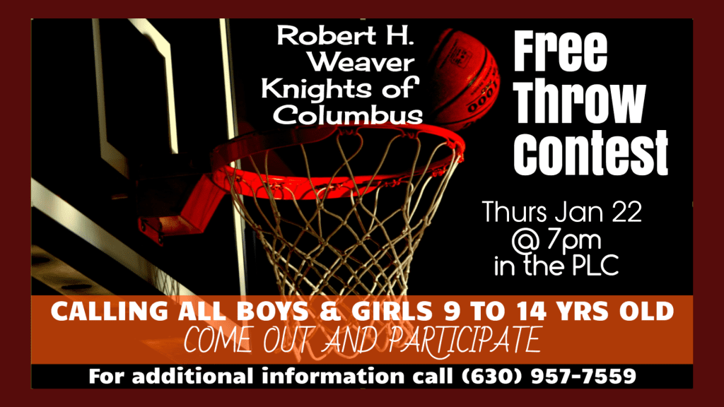 Calling all boys and girls ages 9 to 14 (as of January 1, 2026)—show off your basketball skills at the Robert H. Weaver Knights of Columbus #12005 Free Throw Contest! ![]()