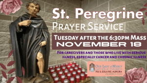 For those with cancer, serious or chronic illnesses, and their caregivers, come to the St. Peregrine Prayer Service on Tuesday November 18 following the 6:30pm Mass.