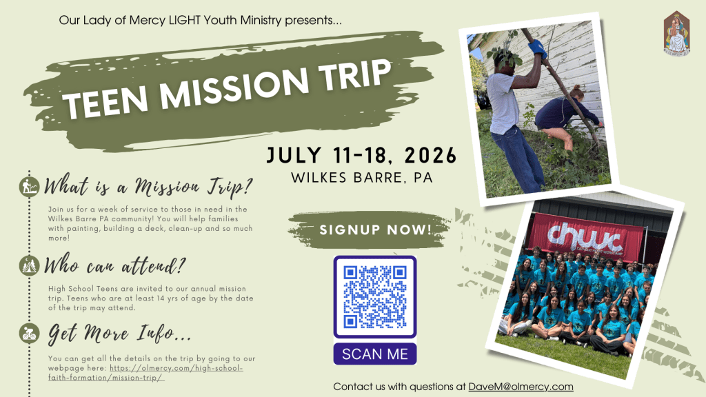 A collection basket will be available in the narthex on the weekend Masses on February 7th and 8th. Your generosity directly supports our teens and helps make this life-changing mission possible. Thank you for partnering with them in prayer and support. Online donations are also welcome, please look for “Youth Ministry Mission Trip” at this link.