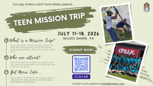 After all Masses on February 7 & 8, our high school teens will share briefly about their upcoming mission trip to Wilkes-Barre, Pennsylvania, where they will serve families in need through Catholic Heart Workcamp.