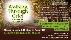Experiencing the loss of a loved one is a difficult journey. Our Lady of Mercy is offering a supportive place for participants (ages 18 and older) to walk through grief together in a faith community to find hope and healing.