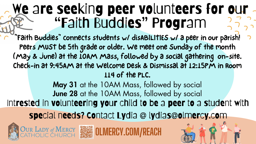 “Faith Buddies” connects children with disABILITIES with a peer in our parish! Peer volunteers must be 5th Grade or older, complete a Volunteer Application, complete a medical/release form, create a VIRTUS Account (if a teen), watch a small video series & demonstrate kindness, patience and respect toward his or her “Faith Buddy”